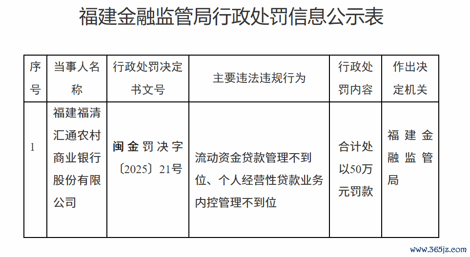 11月26日,福建金融监管局行政处罚信息公示表显示安徽润格,福建福清汇通农村商业银行股份有限公司因流动资金贷款管理不到位、个人经营性贷款业务内控管理不到位被合计处以50万元罚款。