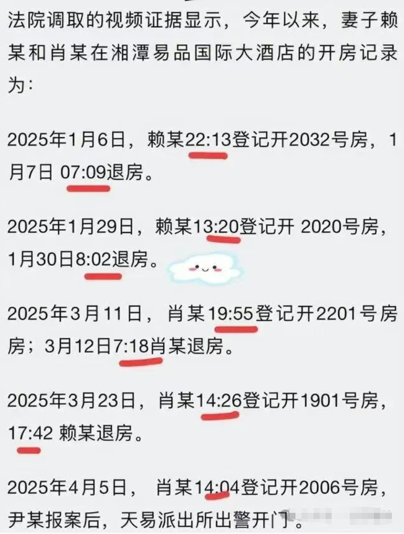 据说,从去年底这位女士突然提出离婚开始,尹先生就觉得事情不太对劲。妻子拒绝见面,搬回了娘家。今年3月,尹先生跟踪发现妻子疑似出轨,4月更是在酒店“实锤捉奸”——对象正是湘潭县市场监督管理局综合行政执法大队的大队长肖某。