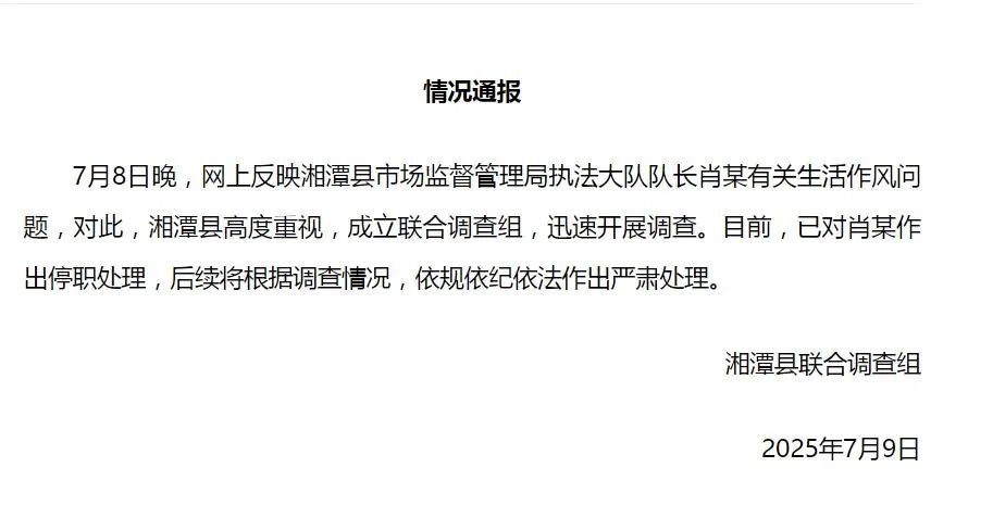 面对汹涌的舆论压力,湘潭县终于坐不住了。7月9日,湘潭县联合调查组火速成立,并发布通报称已对肖某作出停职处理。