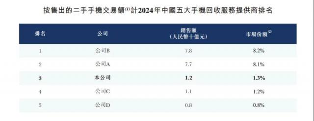 据招股书,2024 年闪回科技按照售出的二手手机交易额计算,闪回科技在中国二手手机回收市场的份额约为 1.3%,为第三大手机回收服务供应商,而爱回收和转转的市场份额分别为 8.2% 和 8.1%。