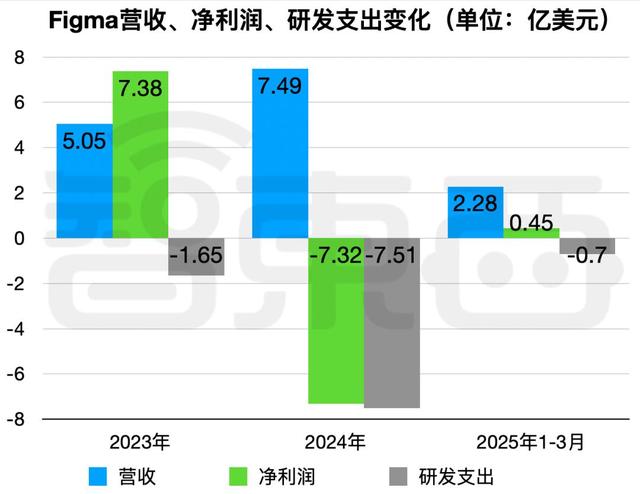 Figma在2023年、2024年和2025年第一季度的研发投入分别为约1.65亿美元、7.51亿美元和0.70亿美元。