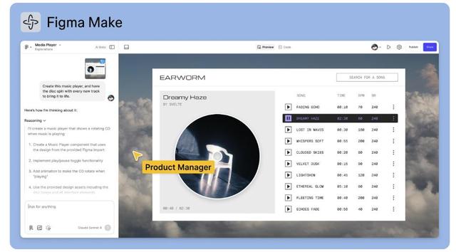 其中,Figma Make是一款AI驱动的可将提示词转化为功能的工具。用户可以直接从指令生成可运行的原型,并且立即验证想法;可以自由选择进一步输入指令、直接编辑代码,还是进行视觉化操作。
