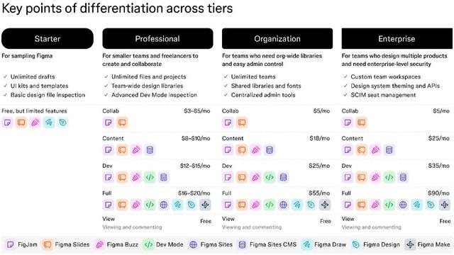 Figma的访问权限以按年或按月订阅的形式出售。如下图所示,其根据特定用户的需求提供不同的档位,包括五个档位:Viewer、Collab、Content、Dev、Full。对应入门者、专业用户、组织用户和企业用户,不同档位对应不同的费用。