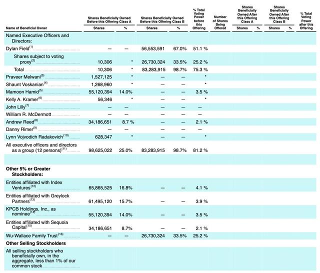 在本次A类普通股发行完成后,两位联合创始人迪伦·菲尔德(Dylan Field)与艾文·华莱士(Evan Wallace)将合计持有已发行及流通的几乎全部B类普通股。受Wallace委托,公司投票权集中于Field,这将限制股民影响重要交易结果的能力,包括控制权变更。