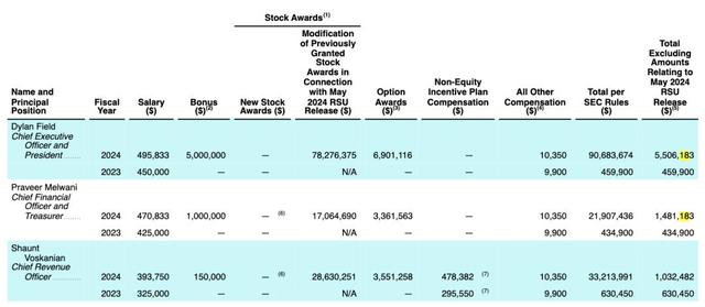 在高管薪资方面,Figma首席执行官迪伦·菲尔德(Dylan Field)2024年总计年薪达到约9068万美元,接近1亿美元,其中包含了约7827万美元,是与2024年5月限制性股票单位解锁相关的先前授予的股票奖励。